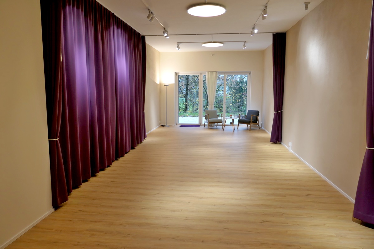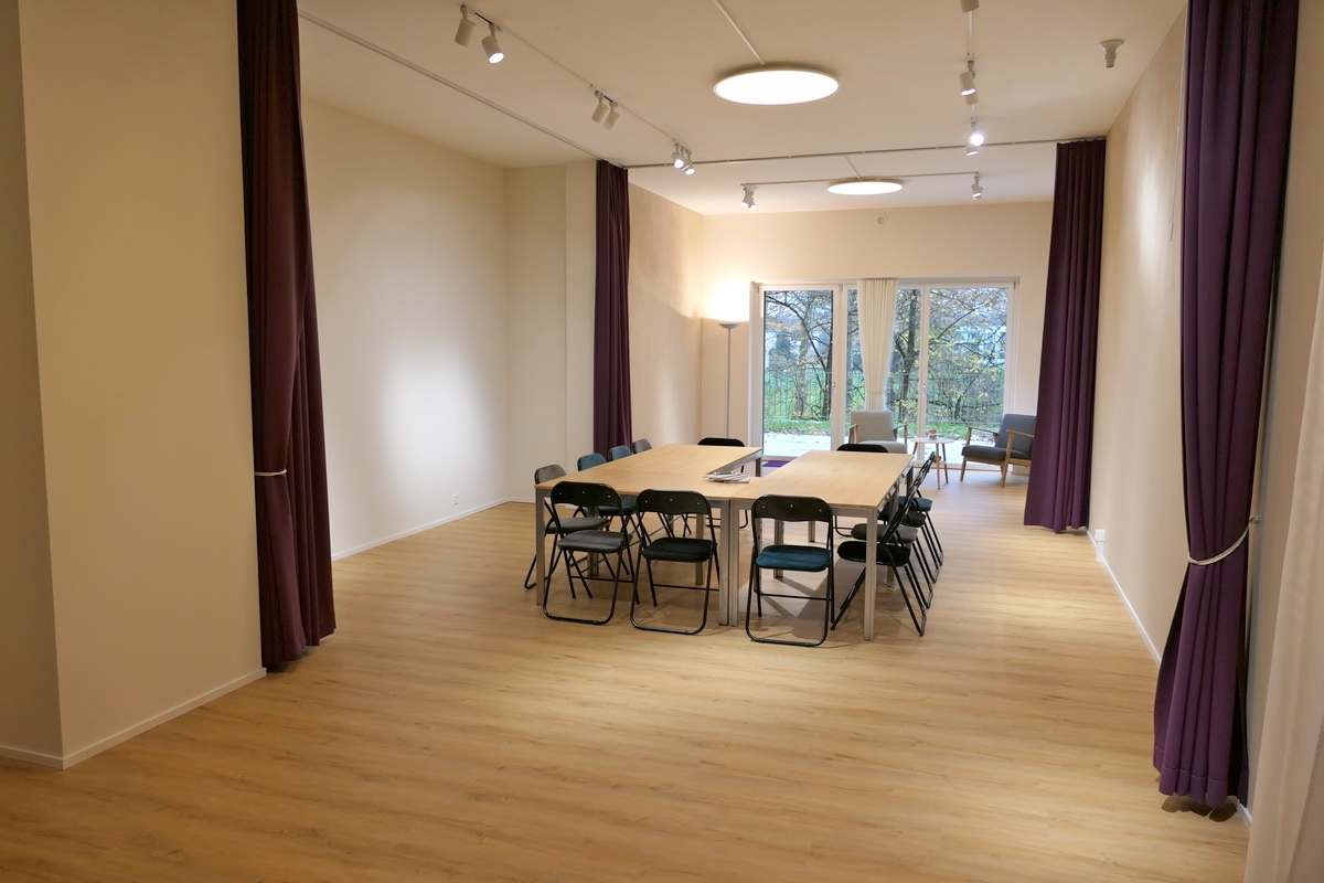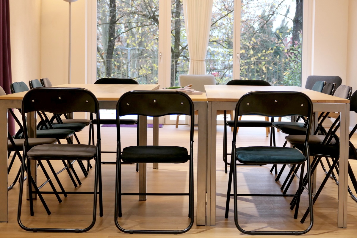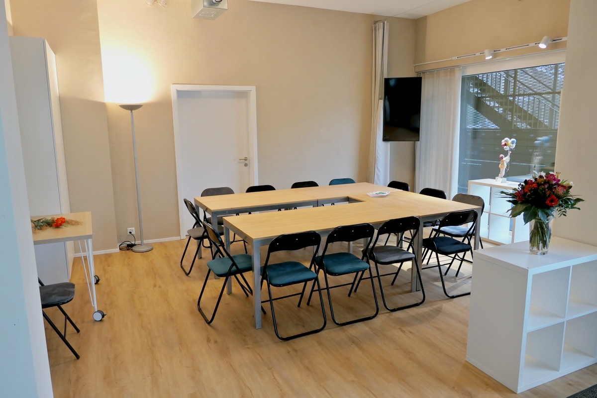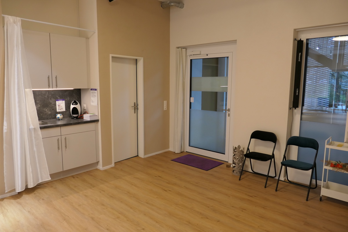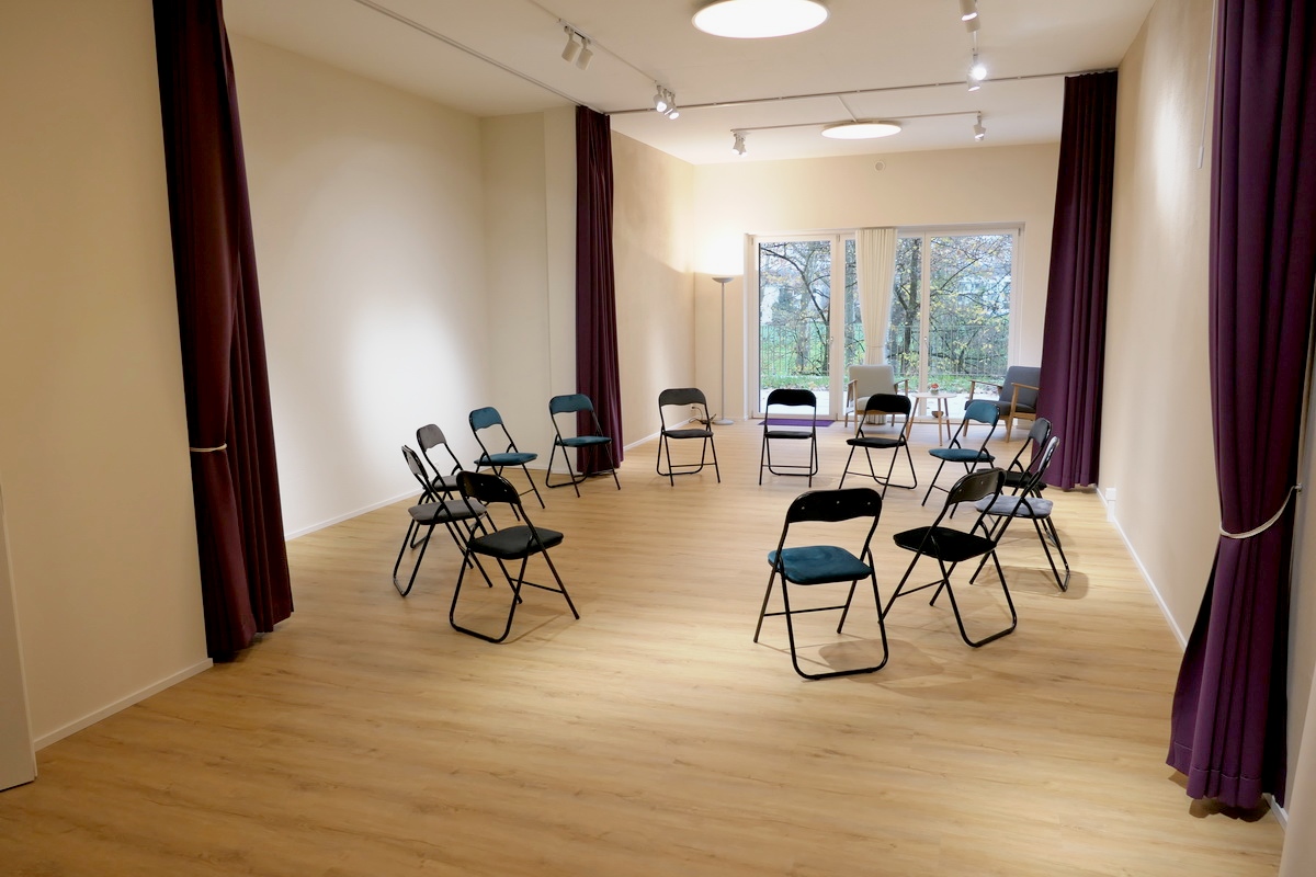 Grosszügiger Raum (60m2), professionelle Physio- und Massageliege, Tische, 50 Stühle, Flipchart, Musikanlage und Stauraum bei Bedarf.